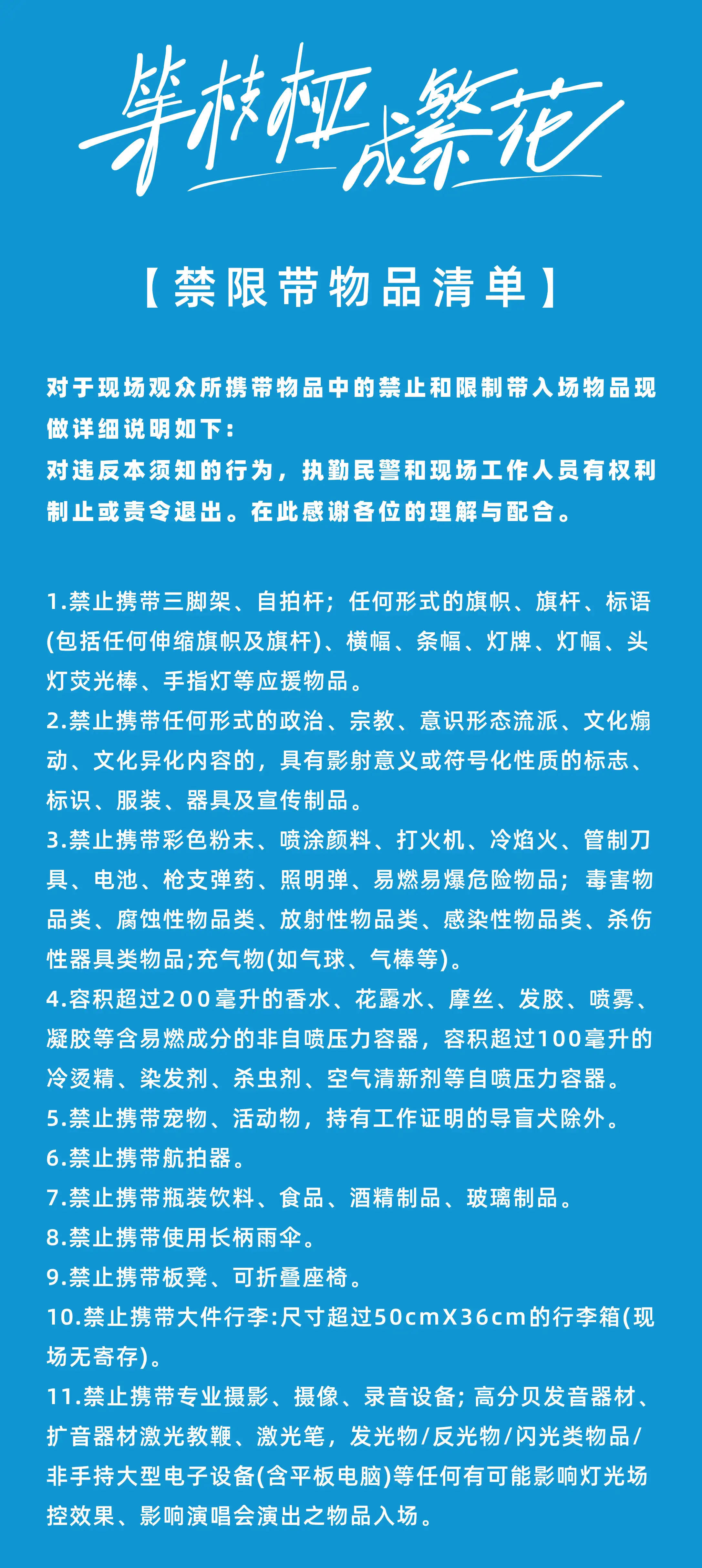 【南昌】等枝桠成繁花-十个勤天巡回演唱会南昌站,请勿携带武器、烟花爆竹、激光器、激光笔、饮料、酒水或食品入场。进场时请持票接受检验,检票后有序入场,不要窜区、窜位、跨越隔离带,禁止滞留在通道、随意走动、站立观看,以免影响他人观看。文明观看演出,遵守现场秩序、请勿翻越隔离设施,感谢您的支持!